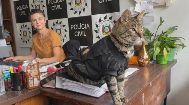 "Às vezes, eu tenho que me ausentar, eu respondo por outra delegacia ou [estou] em viagem, e eu deixo o meu substituto aqui. Ele senta-se na minha cadeira. É uma figura, um querido. Todo mundo o acolheu super bem", brinca o delegado Guilherme Fagundes, dizendo que o felino se adaptou rapidamente ao dia a dia do local.