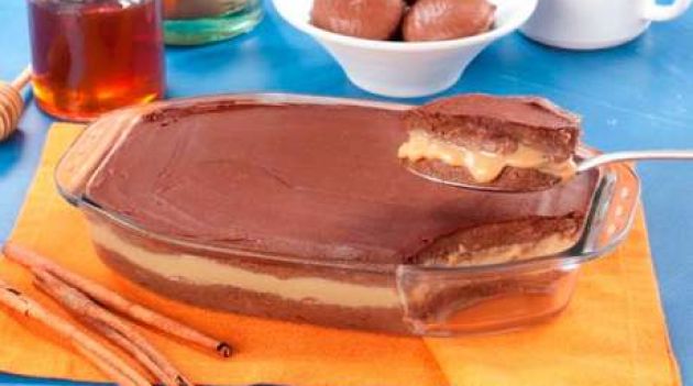 Bata no liquidificador o biscoito até triturar, apertando a tecla pulsar. Despeje em uma vasilha, acrescente o chocolate, a canela, o leite em pó e misture. Adicione o leite condensado, o creme de leite e mexa até ficar homogêneo. Despeje metade em um refratário oval médio, alisando com uma espátula. Espalhe o doce de leite e cubra com a massa restante. Leve à geladeira por 3 horas. Para a cobertura, derreta o chocolate com a manteiga em banho-maria. Espalhe sobre o doce e leve à geladeira por mais 1 hora. Retire e sirva.