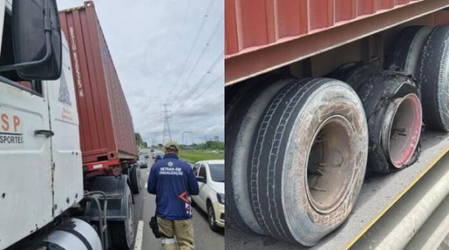 “Durante patrulhamento de rotina, a equipe constatou o caminhão transportando um container, quase tombando em via pública. Ao ser abordado, foi verificado que o condutor não era habilitado, o veículo apresentava alteração de característica e mau estado de conservação, uma vez que todos os pneus se encontravam em péssimas condições de uso, inclusive com um dos pneus estourados. Diante de tantas irregularidades, o veículo foi removido para o parqueamento”, detalhou Arthur.