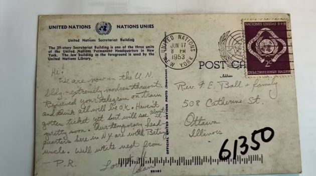 Street. A mensagem da carta está assinada por "Alan". Ao se deparar com o cartão-postal retratando o prédio das Nações Unidas em Nova York com um carimbo de 1953, Mark Thompson, chefe dos correios de Ottawa, se interessou pelo caso da carta que chegou com sete décadas de atraso. Foi com a ajuda de genealogistas locais que ele conseguiu localizar o remetente, que felizmente ainda estava vivo.