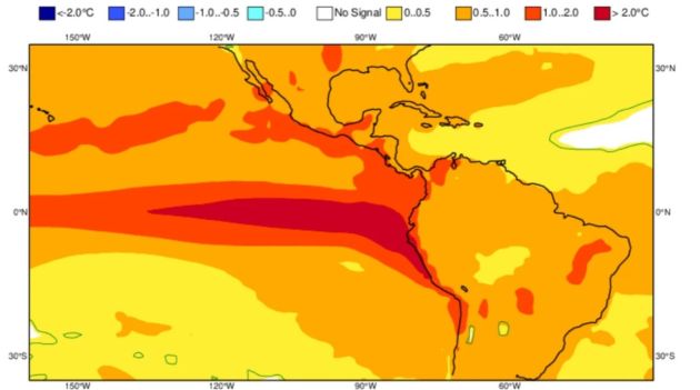 A partir daí, os modelos apontam para o desenvolvimento do El Niño. O El Niño é caracterizado pelo aquecimento maior ou igual a 0,5°C das águas do Oceano Pacífico equatorial.