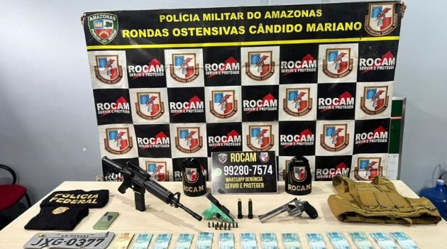 Durante a ação, os policiais apreenderam um verdadeiro arsenal e itens de disfarce, incluindo duas armas de fogo, um simulacro de fuzil, munições, coletes e camisas com identificação policial. O suspeito tentou fugir em um veículo Onix com placa adulterada, mas foi interceptado pelos agentes após seus comparsas fugirem a pé.